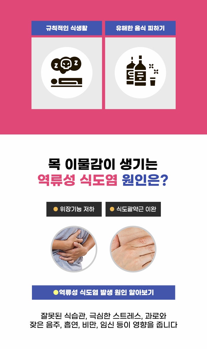 위장 기능이 약해진 상태에서 식도 역류 증상이 쉽게 일어나기도 합니다. 위염은 위 질환 중 대표적으로 알려진 질환이라고 하는데요. 현재 목 이물감과 식도역류 증상으로 고생하는 분이라면 위염이나 다른 위장 질환, 소화기 질환을 함께 갖고 있는 경우도 있다고 합니다.