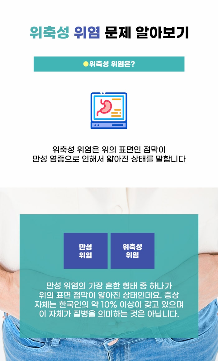 그런데 현재 만성 위염을 겪고 있다면 알아야 할 게 있습니다. 현재 겪는 복통이나 쓰린 증상도 괴롭지만, 시간이 흐르면서 또 다른 문제가 생길 수도 있다는 점인데요. 만성 위염이 오래될 경우 위축성 위염 상태가 될 수도 있습니다. 사실 이 증상 자체는 우리나라 성인들에게 흔하다고 하는데요. 하지만 위의 표면 점막이 얇아지는 위축성 위염과 위암의 발생 확률 연관성이 알려지고 있다고 합니다.