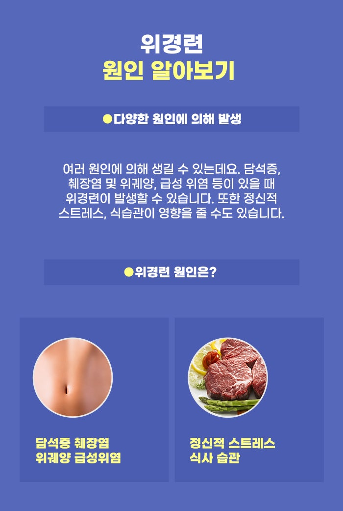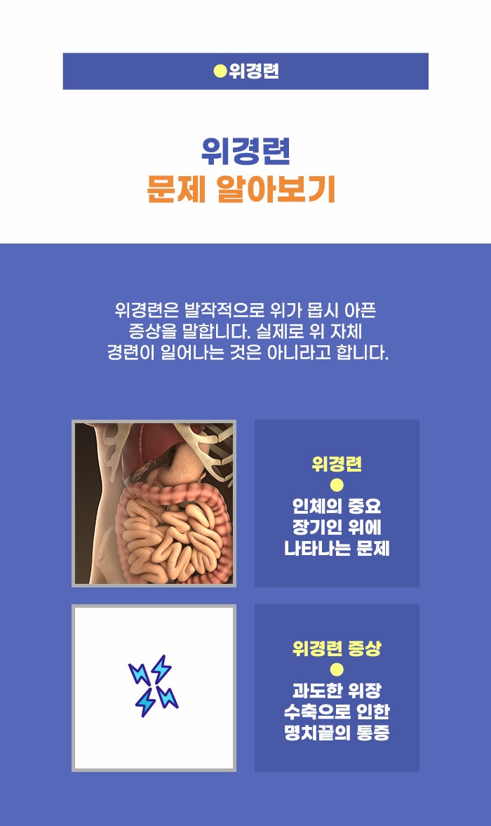 위궤양은 위경련 문제와 연관이 있는 다른 질환인데요. 위산, 펩신 성분은 위의 주름 사이에서 분비되는 위액 성분입니다. 그런데 위산 과다, 위장의 기능 문제 등 여러 이유로 인해 소화를 도와야 하는 이 성분이 위를 공격할 수 있는데요. 위장 점막의 결손이 생긴 상태이며, 조직학적으로는 괴사한 위 점막 결손이 점막하층 이하까지 생긴 상태가 위궤양이라고 합니다.