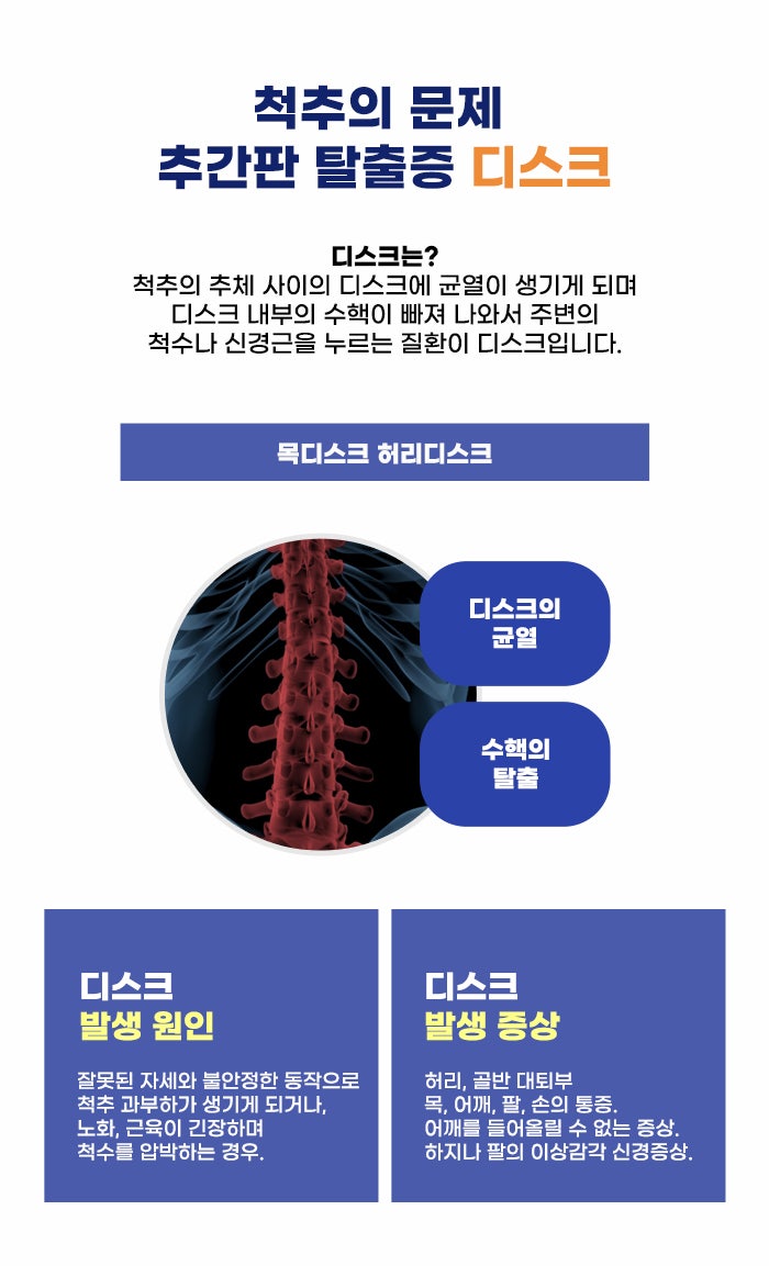 큰 사고를 겪은 후 주의해야 하는 척추질환으로 추간판 탈출증 문제가 있다고 합니다. 추간판 탈출증은 어떤 문제일까요? 추체 사이의 질기고 또 유연한 조직을 두고 추간판이라고 합니다. 추간판이 탈출하고 밀려 나오면서 신경근을 자극하는 게 추간판 탈출증이라고 부르는데요. 간단하게 디스크라고도 부릅니다. 추간판이 영어로 디스크이기 때문입니다. 외부 충격이 강하게 전해지면서 추간판 탈출증, 만성 척추질환의 위험이 커질 수도 있다고 합니다.
