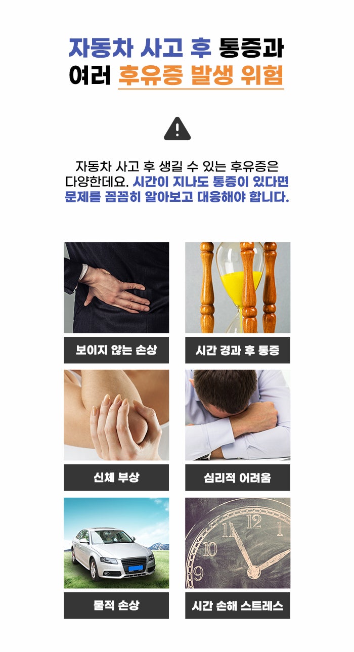 사고의 충격에, 일상생활의 피로 문제가 더해지면서, 뻐근함, 저림, 통증 등으로 오랜 시간 고생할 수도 있다고 합니다. 물론 안전운전을 하고 노력하는 사람은 그렇지 않은 사람에 비해 사고 가능성이 낮아지는 편이라고 하는데요. 현재 사고를 겪었지만 겉으로 보이는 상처나 통증이 없고 이상이 없어 보여도, 실제로는 몸에 이상이 남을 수도 있다는 점을 아셨으면 합니다.