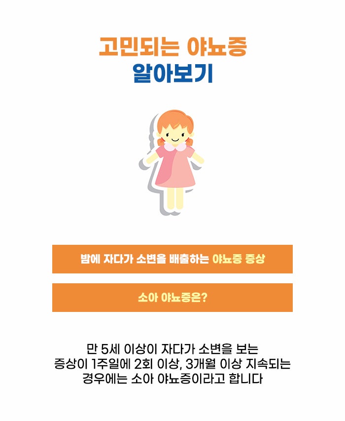배뇨기능의 발달, 방광 용적의 변화, 사회적 교육 등의 많은 노력과 성장이 이루어진 후에 할 수 있게 됩니다. 보통 아이가 5세 정도가 되면 스스로 화장실에 갈 수 있고 대소변을 가릴 수 있게 자라게 되는데요. 그렇기에 야뇨증의 경우 기준이 되는 나이가 5세 정도라고 합니다. 현재 이 페이지를 보고 있는 분의 경우 파주 운정 야뇨증 고민하는 분이 많을 것 같습니다.