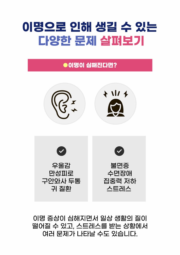 현재 기력이 쇠약해질 만한 이유가 있는 상태라면 이명 문제를 비롯해 체력 저하, 집중력 저하 등의 여러 문제를 겪을 수 있다고 하는데요. 몸과 마음의 휴식 시간인 수면 시간이 지나치게 줄어든 상태라면 주간 기능 저하와 건강 문제가 나타날 수도 있다고 합니다. 현재 잠을 이루지 못하면서 이명 증상이나 다른 고민이 생긴 상태라면 규칙적인 수면 패턴을 찾기 위해 힘쓰셨으면 합니다.