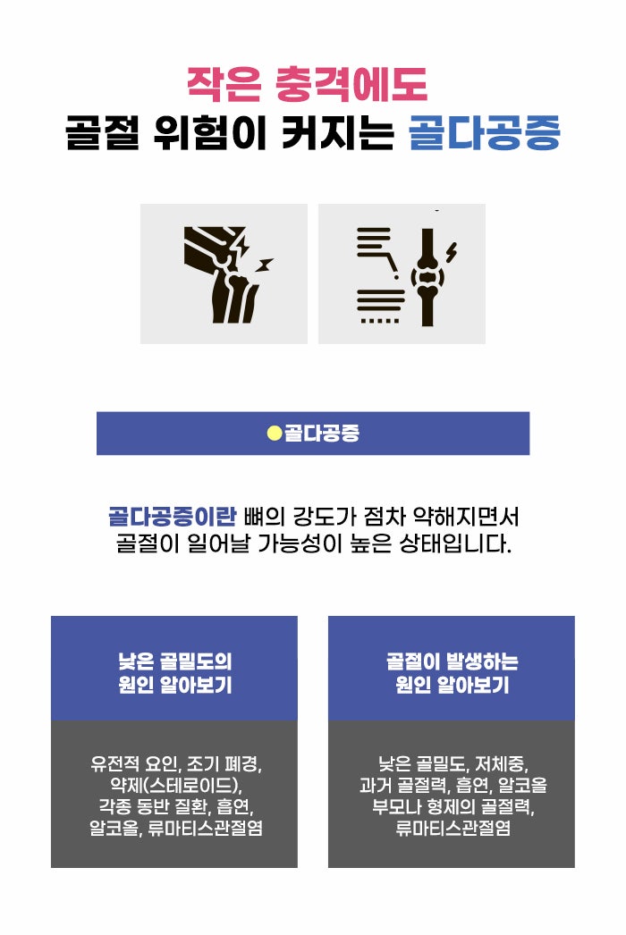 교통사고 후 주의해야 할 것으로 골다공증이 있는데요. 같은 충격이 전해져도 골절이 생기지 않는 사람이 있고, 골절이 생기는 사람이 있습니다. 뼈가 약해지는 골다공증이 이미 있는 사람이라면 작은 충격에도 골절이 생기고 회복이 될 때까지 큰 고생을 할 수 있는데요. 골다공증은 먼저 골절이 되기 이전에는 증상이 거의 없을 수 있습니다. 그렇기에 평소 골다공증 위험에 대해서 알고 예방을 위해 노력하면 좋겠습니다.