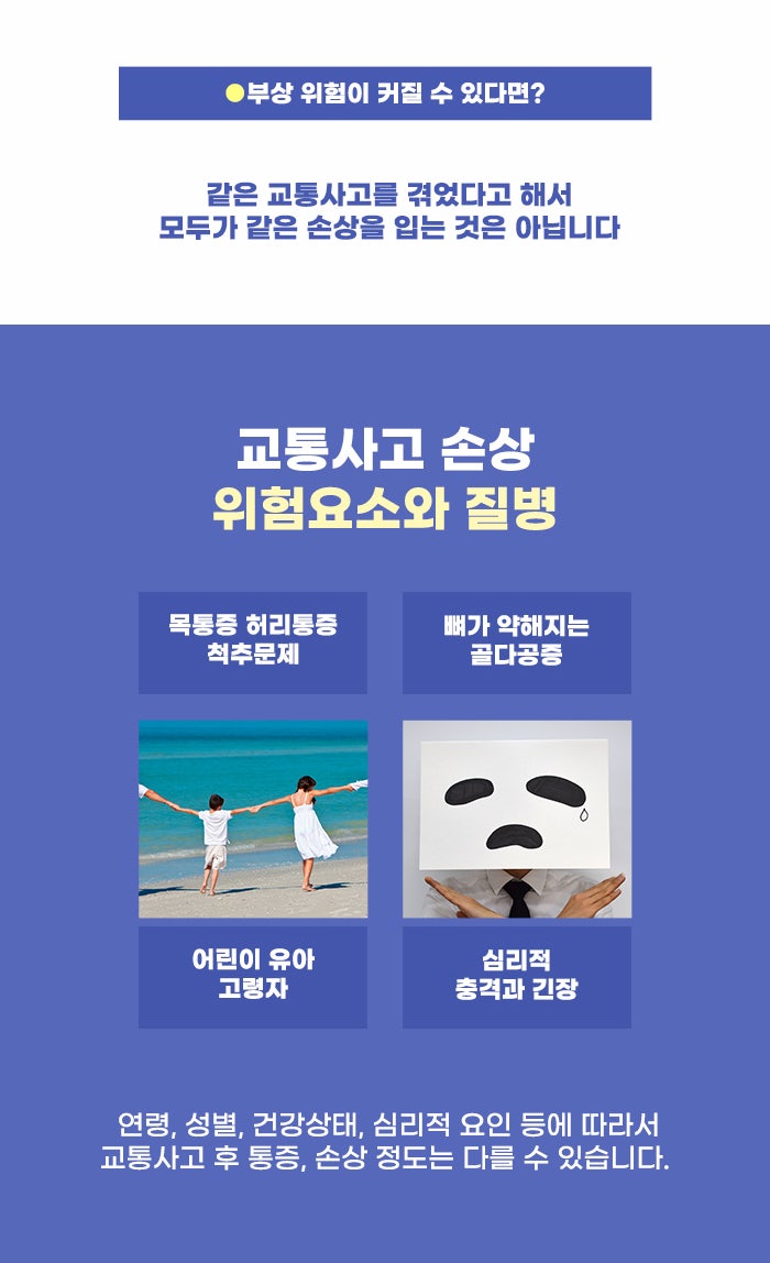 건강한 성인에 비해 어린이의 교통사고 손상, 그리고 몸이 약한 분이나 고령자의 교통사고 손상은 더 클 수도 있습니다. 또한 사고 당시 상황, 그리고 좌석과 충돌 위치 등에 따라서도 사고 이후 손상이 클 수도 있다고 하는데요. 같은 사고를 겪었어도 개인이 겪는 충격과 통증은 다를 수 있다는 점을 알고 운정교통사고치료 보험적용 면밀히 살펴보셨으면 합니다.