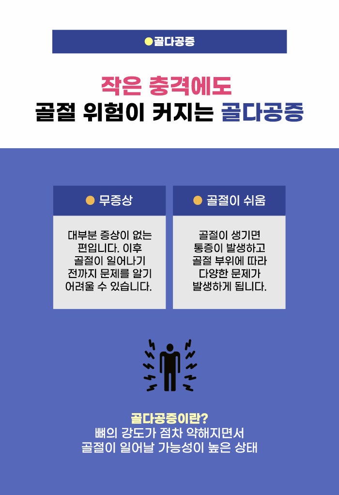 갱년기에 주의해야 할 것 중 하나가 바로 뼈 건강이라고 합니다. 골밀도가 줄어들고 뼈의 강도가 약해질 수 있습니다. 뼈는 전신의 균형을 잡아주고 여러 활동을 할 수 있게 해주는 핵심 요소입니다. 이 뼈 건강이 약해질 경우 활동에 제약이 생기게 되는데요. 골다공증은 골절이 되기 전까지 특별한 문제를 느끼지 못하기도 합니다.