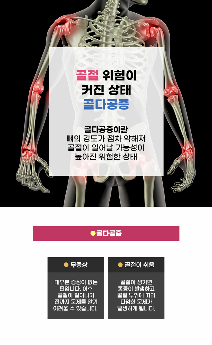 어린시절과 다르게 회복력도 느려지고 몸도 약해지는 시기이다 보니 비슷한 사고를 겪어도 청년기에 비해 더욱 큰 고생이 될 수도 있는데요. 특히 골절이 쉬워지는 골다공증이 있는 분이라면 더욱 그렇습니다. 작은 충격에도 쉽게 뼈가 부러지는 상태가 되는 것, 골밀도가 줄어들고 뼈가 약해지는 게 골다공증이라고 합니다.