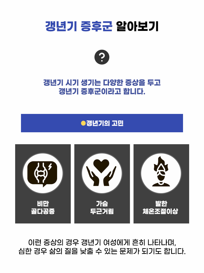 우리나라 여성의 약 60%가량이 여성호르몬 급성 결핍으로 인한 증상을 경험한다고 합니다. 가슴이 두근거리고 땀이 나는 증상, 불안감, 우울감 등을 겪는 분도 있는데요, 이런 증상을 약 20% 정도는 더 심하게 겪는다고 합니다. 특히 밤에 증상이 심한 경우가 많아 불면증으로 이어지기도 하고 파주갱년기 정보 고민되는 만성 피로를 느끼기도 합니다.