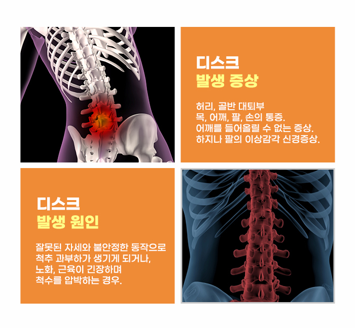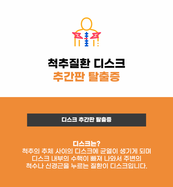 추간판은 척추를 이루는 추체 사이의 조직을 말합니다. 이 추간판의 안에는 수분 함량이 높아 말랑말랑한 수핵이 있으며 겉은 질긴 섬유륜입니다. 추간판은 척추에 가해지는 충격을 분산하고 유연한 움직임이 가능하도록 하는데요. 추간판에 과도한 압력이 가해질 경우 추간판이 찢어지고 수핵이 밀려 나오며, 통증이 생기게 될 수 있습니다. 이 질환이 추간판 탈출증인데요. 간단하게 디스크라고 부르고 있습니다.