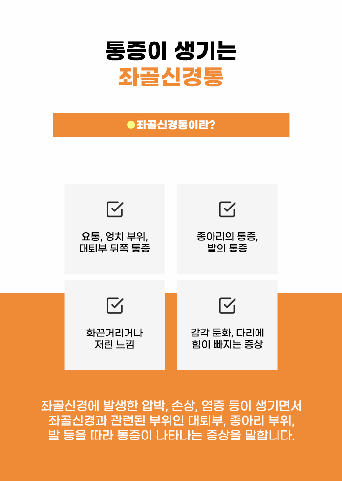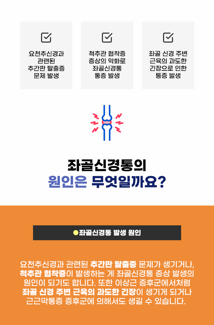 척추 문제가 생기면서 허리 부분에 통증이 생기는 것 말고도, 다른 문제로 이어질 수도 있다고 합니다. 좌골신경은 요천추신경인데요, 이 요천추신경과 관련된 추간판 탈출증 혹은 척추의 추간공이 좁아지는 척추관 협착증이 발생하는 게 좌골신경에 통증이 발생하는 데 영향을 줄 수도 있다고 합니다. 파주운정허리디스크 염려되는 상황이라면 미루지 말고 나의 건강을 위한 방법을 찾길 바랍니다!