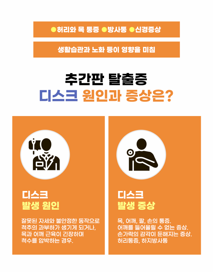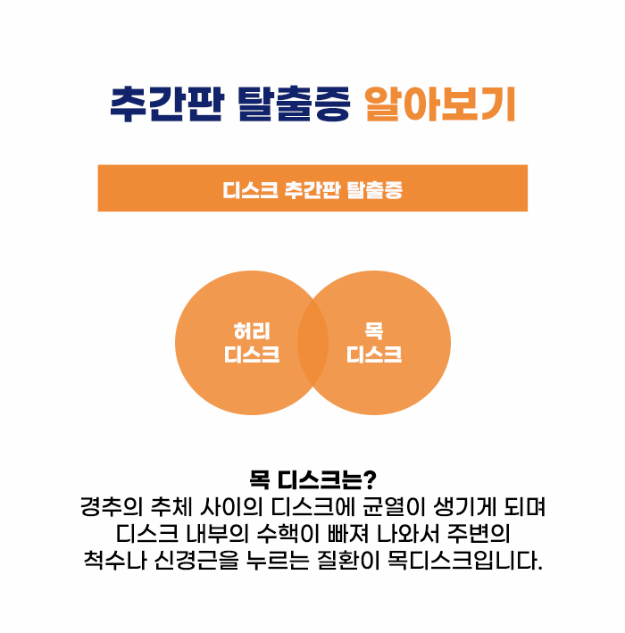 추간판은 척추의 한 부분이며, 다른 말로는 디스크라고 합니다. 이 추간판에 이상이 발생하는 질환인 추간판 탈출증은, 발생하는 부분에 따라서 경추 추간판 탈출증, 요추 추간판 탈출증이라고 합니다. 이 이름을 간단하게 줄여 디스크라고 부르는 경우가 많습니다. 척추 질환 중 많은 분이 겪고, 또 많이 알려져 있다 보니 허리가 아프거나 목이 아픈 상태에서 '디스크 문제가 아닐까?' 같은 생각을 하는 분이 많습니다.