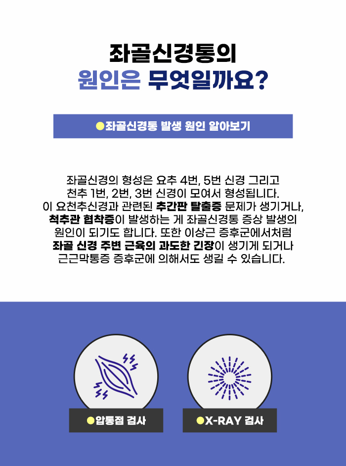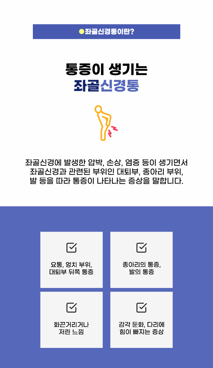 척추에 문제가 생길 경우, 처음에는 큰 이상이 나타나지 않을 수도 있는데요. 보상 한계를 넘어서면서 급격히 통증이 생기고 생활하는 데 어려움이 생길 수 있습니다. 파주운정목디스크 고민하고 있는 분이라면, 작은 증상도 놓치지 말고 정보를 파악하며 건강을 지키기 위해 힘쓰셨으면 합니다. 또한 좌골신경통은 좌골신경의 이상으로 통증이 생기는 문제인데요, 요천추신경과 관련된 척추질환도 좌골신경통의 발생에 영향을 줄 수도 있다고 하니 참고하셨으면 합니다.