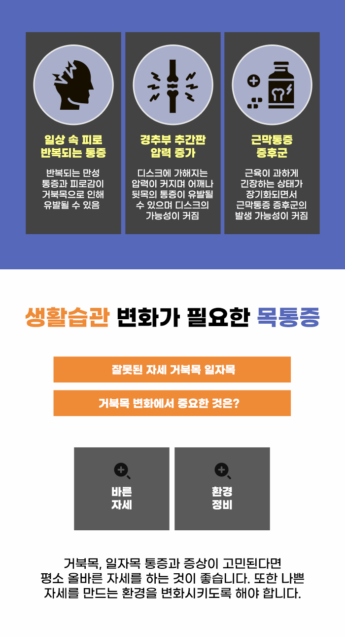 위의 증상이 있는 경우 파주운정목디스크 문제를 알아보는 게 필요할 수도 있는데요. 왜 디스크 문제가 생기게 될까요? 디스크가 발생하는 원인, 특징은 개인에 따라서 다를 수도 있고, 명확하게 판단하기 힘든 경우도 있습니다. 다만 파주운정목디스크 고민하게 되는 원인 중 하나로 고려되는 게 있는데요, 바로 잘못된 자세라고 합니다. 거북목, 일자목 문제도 디스크의 발생에 영향을 줄 수도 있습니다.