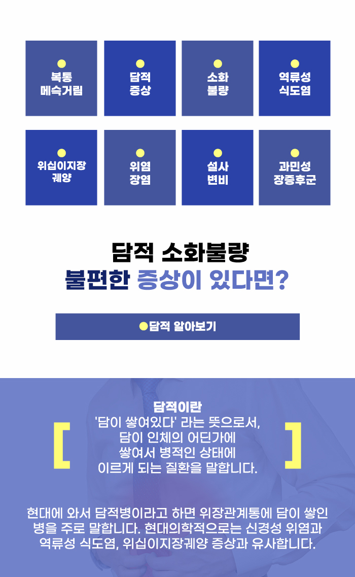 담적이 걱정되는 위장관계통의 증상은 어떤 것이 있을까요? 자주 속이 더부룩하고 소화도 힘든 것 같을 때, 담적에 대해서 고민할 수 있습니다. 또한 밀가루 음식을 먹고 난 후에 잘 체하거나, 조금만 많이 먹어도 잘 체하는 경우도 있습니다. 식욕이 별로 없고 조기 만복감으로 식사를 충분히 하기 어려운 경우, 과식 후 역류가 잘 일어나는 경우에도 담적이 의심스러울 수도 있다고 합니다.