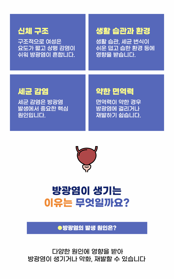 그렇기에 현재 만성 방광염, 염증의 재발로 인해 고민하고 있는 분이라면 건강한 일상을 지키기 위한 방법, 내 몸의 염증을 조절하는 방법을 찾으셨으면 합니다. 또한 균이 쉽게 침투할 수 있는 습관이나 환경을 바꾸고 스스로 노력하는 것도 중요할 수 있다고 합니다.