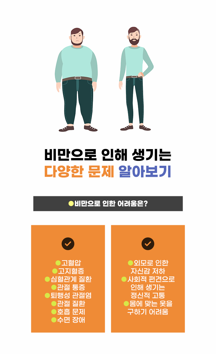 특히 비만에 대해서 잘 모르는 상황이라면, 비만 대응에 더욱 힘들 수 있습니다. 현재 비만 상태인 분은 건강상의 어려움을 겪을 수 있는데요, 특히 복부비만 내장지방은 성인병의 위험이 큰 비만 형태라고 합니다. 또한 체중이 불어나면서 활동하는 데 어려움이 커지고 관절의 부담도 커질 수 있습니다. 족저근막염, 무릎이나 발목 통증 등이 생기기도 하고, 역류성 식도염 같은 문제가 생기기 쉬울 수도 있다고 합니다.