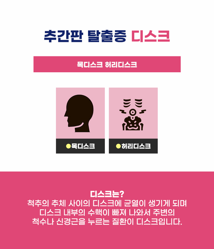 디스크 손상이 생기면서 발생하는 질환이다 보니, 간단히 디스크라고 말하는 경우가 있는데요, 이 질환의 정확한 이름은 추간판 탈출증이라고 합니다. 추간판 탈출증은 주로 요추(허리) 그리고 경추(목 부분)에 생기게 되는데요, 그렇기에 각각 허리 디스크(요추 추간판 탈출증), 목 디스크(경추 추간판 탈출증)이라고 불린다고 합니다.