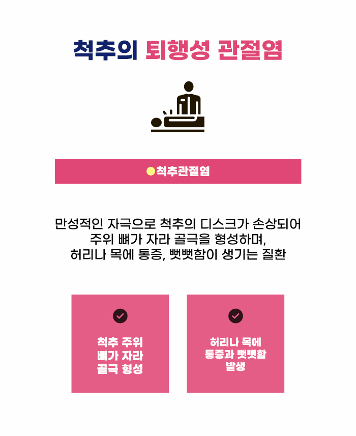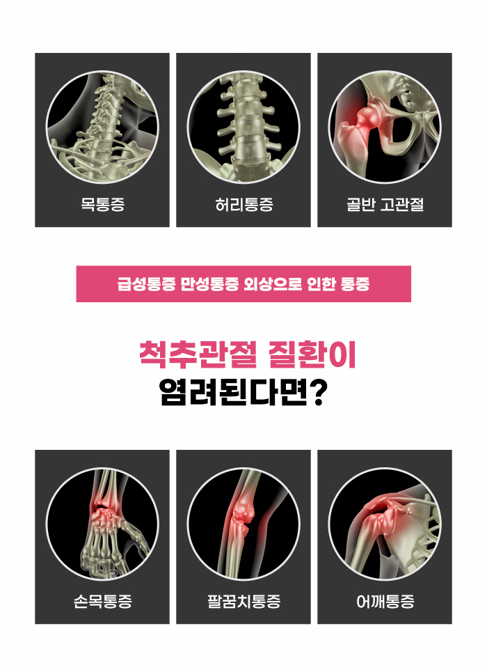 척추 퇴행성 관절염 외에도, 여러 척추 질환이 존재하는데요, 추간판이 찢어지고 수핵이 돌출되는 추간판 탈출증, 추간공 안의 척수가 압박받으며 통증, 신경 증상이 생기는 척추관 협착증 등의 여러 문제가 존재합니다. 현재 허리가 아프거나 목 통증, 피로 등이 생기면서 걱정된다면 나의 문제를 파악하길 바랍니다!