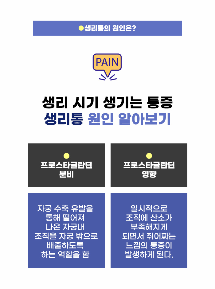 이렇게 생성된 프로스타글란딘이라는 물질은 세포 밖으로 유리된다고 합니다. 이 프로스타글란딘 물질은 월경 시 자궁근육의 강한 수축을 일으키게 되는데요, 이 때문에 강한 통증을 느낄 수도 있다고 합니다. 이 생리통은 출산 시 생기게 되는 산통과 유사한 특징이 있다고 합니다.