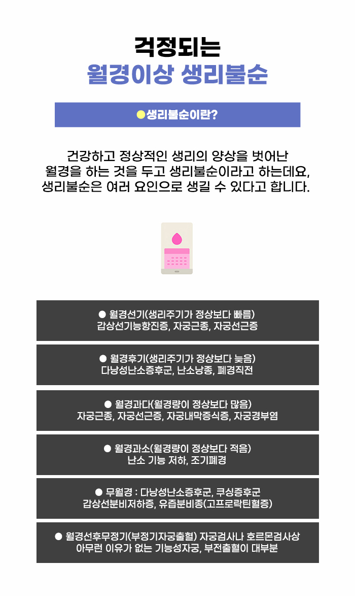 현재 생리통으로 인해 파주생리통 관련 정보를 찾는 분의 경우, 생리 시기 통증만이 아니라 생리주기 이상 등 다른 문제를 갖고 있는 경우도 있는데요, 생리 시기가 불규칙하거나 시기 외에도 출혈이 있는 경우에 속하는 분도 있습니다. 또한 생리량이 지나치게 적거나 많은 경우도 있는데요, 정상적이지 않은 생리 양상을 두고 생리불순이라고 합니다. 생리통과 함께 생리불순 증상이 있다면 원인 질환이 있는지 꼼꼼히 알아보셔야 하겠습니다!