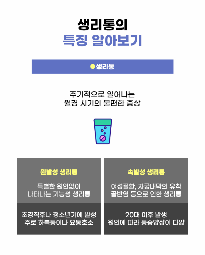원발성 생리통이라고도 부르는 일차성 월경통은, 자궁 내 프로스타글란딘 생성의 증가로 인해 생리통이 생기는 경우가 많다고 하는데요, 특정한 질병에 의해서 생기는 문제가 아니라고 합니다. 또한 10대에서 20대 초반, 아직 완전히 몸이 성장하지 않은 청소년기 여성에게 이런 생리통이 발견되는 경우가 많다고 합니다.