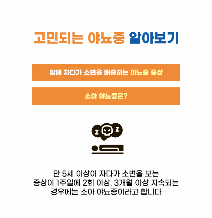 특히 아이가 깨어있는 낮 동안에는 큰 문제가 없는 경우도 있으며, 화장실에 데려가기도 하며 도움을 줄 수 있습니다. 하지만 밤에 자는 시간에는 그러는 게 쉽지 않은데요, 잠을 자는 시간 동안 자주 깨어나 화장실에 가는 경우도 있지만, 그렇지 않고 잠을 자는 동안 소변을 배출하는 경우도 있습니다. 이런 증상을 두고 야뇨증이라고 합니다.
