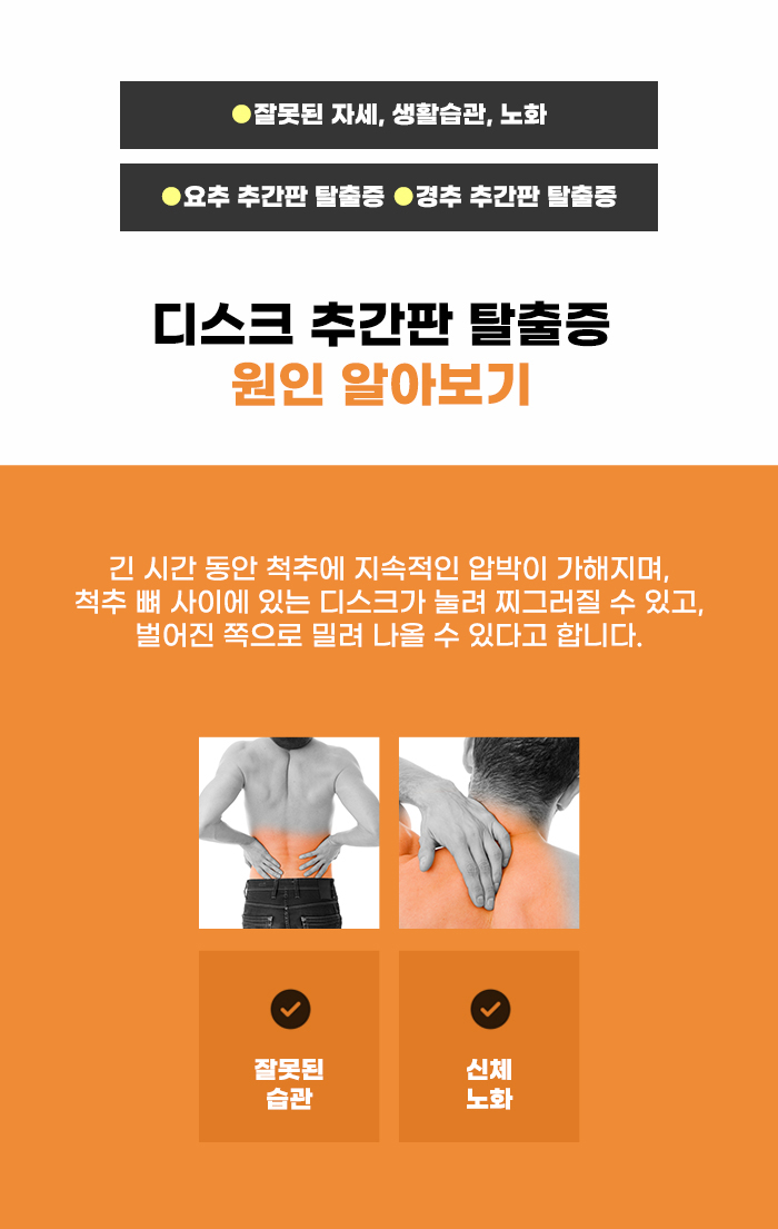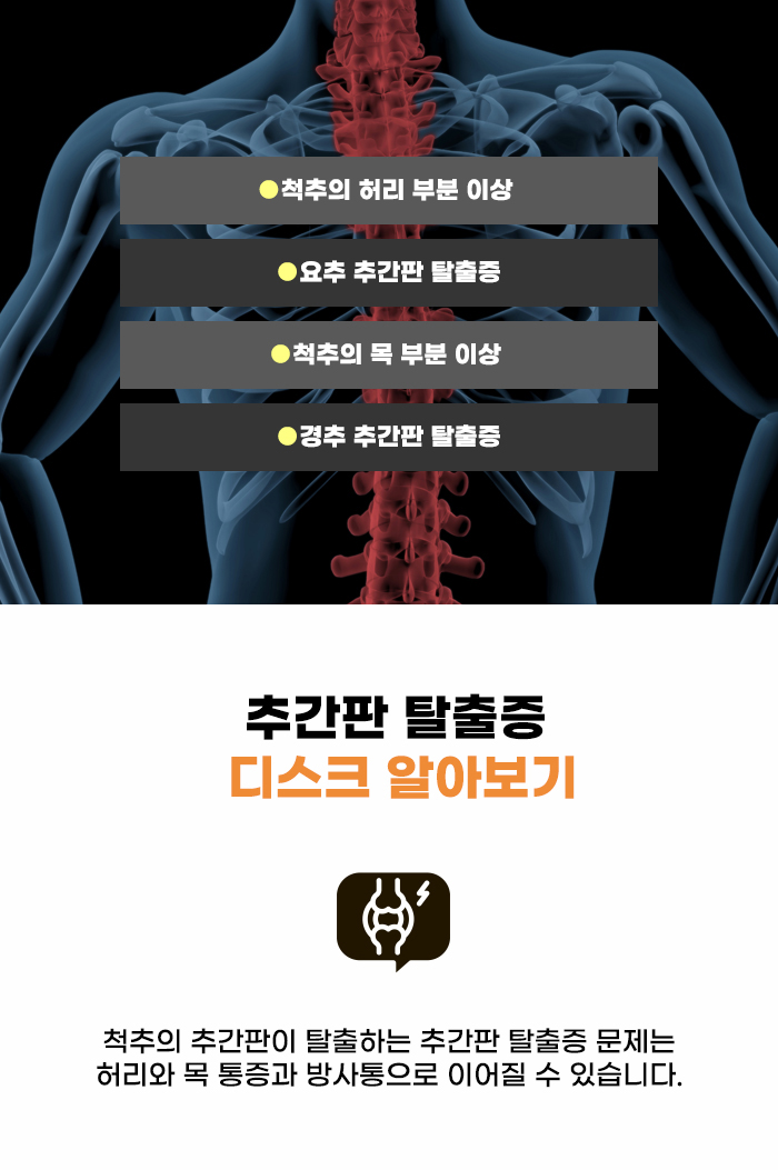 특히 많은 분이 고민하는 질환이 바로 추간판 탈출증이라고 합니다. 추간판이라는 부분은 영어로 디스크라고도 불립니다. 척추에 과부하, 과도한 충격이 전해질 경우 척추의 작은 뼈인 추체 사이 디스크에도 압력이 가해지게 됩니다. 디스크는 유연하게 몸을 움직일 수 있게 해주고 척추 구조물이 안정적으로 유지되도록 하는 중요한 부분인데요.