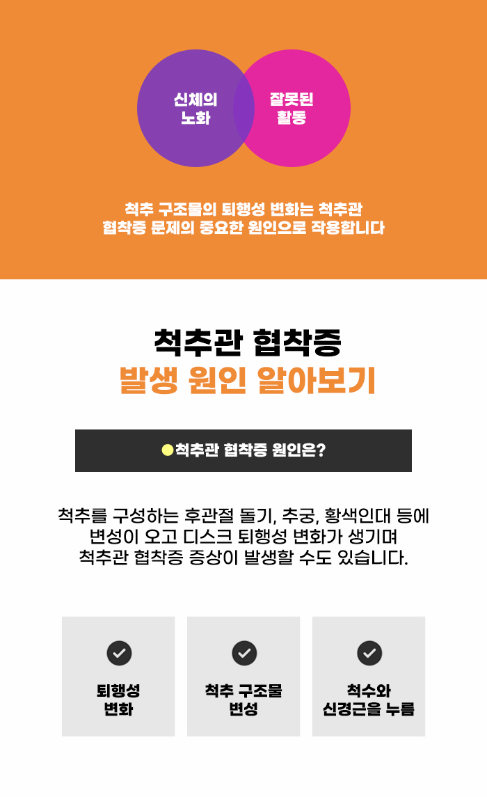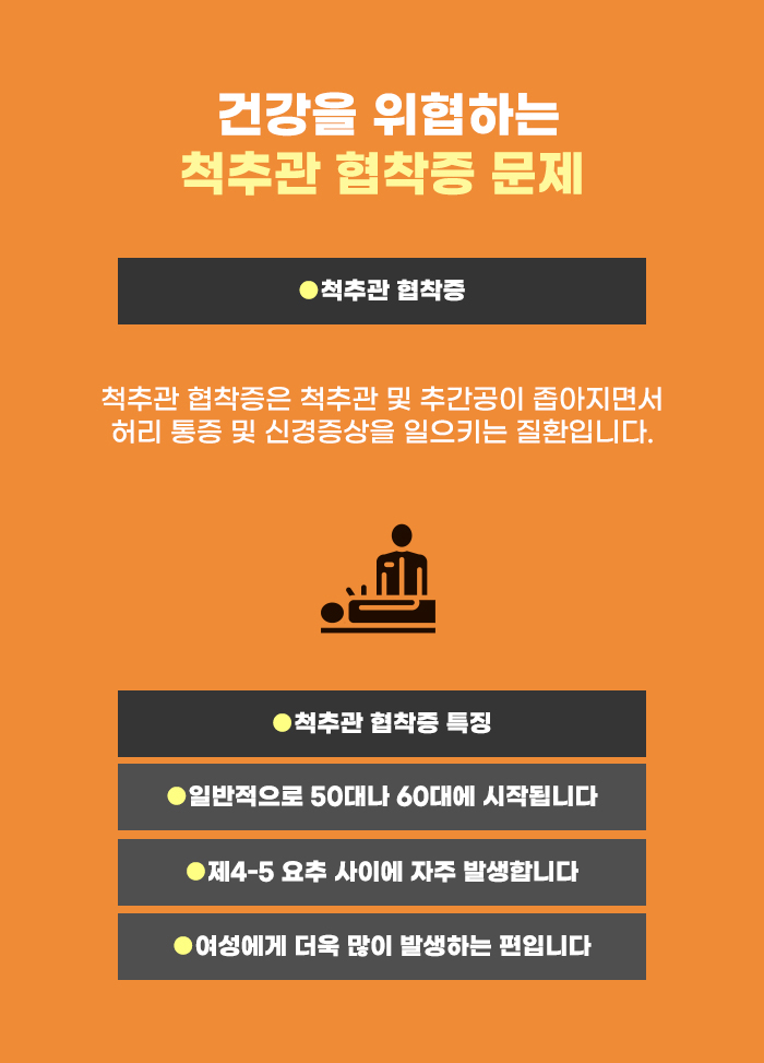 척추관 협착증은 척추 안의 신경 다발이 지나는 공간이 좁아지고, 압력이 높아지는 문제인데요, 그러면서 신경에 압박, 손상이 생길 수 있습니다. 이로 인해 통증과 신경 증상, 보행 장애 등이 나타나게 될 수도 있다고 합니다. 현재 허리가 아프거나 하지 저림 등의 증상으로 고민하고 있는 중이라면 나의 증상, 질환에 대해서 올바르게 알 수 있었으면 좋겠습니다.