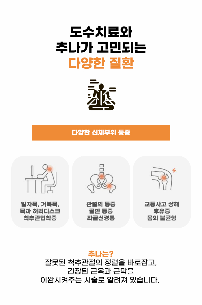 나도 모르게 자꾸 손이 허리로 가고, 허리를 두드리고 있다면? 목이나 허리가 뻐근하고 아플 경우 운정도수치료 궁금할 수 있는데요, 좋은 자세를 찾고 싶어서, 통증에서 벗어나기 위해서 등의 이유로 도수나 추나에 대해서 관심을 갖는 분이 많아지고 있는 것 같다는 생각도 듭니다.
