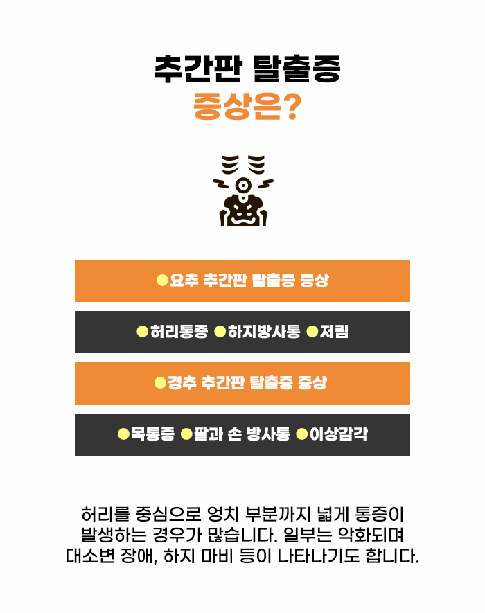 추간판 탈출증은 주로 척추에서 목과 허리 부분에 생기는데요, 그렇기에 간단하게 목 디스크나 허리 디스크로 부르는 경우가 많습니다. 허리에 추간판 탈출증이 생길 경우 허리 통증, 다리와 발 등의 하지 방사통이 생길 수도 있습니다. 감각 이상과 저림 등이 생기기도 합니다. 그리고 목 디스크가 생길 경우 목과 팔, 손 등에 통증, 저림, 뻐근함과 피로감 등이 생길 수도 있다고 합니다.