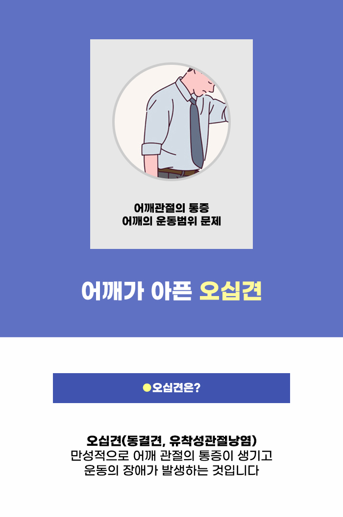 어깨가 아파서 파주오십견 정보를 알아보고 있다면? 어깨에 생기는 문제 중 하나인 오십견은, 주로 오십 대, 중년의 연령에 많은 분이 이 질환을 겪다 보니 붙여진 별명이라고 하는데요. 원래는 유착성 관절낭염이라는 이름이라고 합니다. 그리고 다른 별명으로는 동결견이라는 말도 있습니다.
