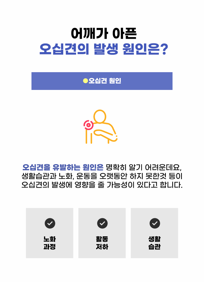 그런데 왜 파주오십견 문제가 생기게 될까요? 오십견의 발생 원인에 대해서 궁금할 수 있는데요. 오십견의 발생 원인은 명확하게 단정하기 어려울 수 있다고 합니다. 다만 여러 원인을 추측할 수도 있는데요, 어깨 자체의 질환이 있는 경우 어깨관절의 운동에 문제가 생길 수도 있다고 하며, 노화, 오랜 시간 어깨를 잘 사용하지 않았던 경우 등에 영향을 받을 수도 있다고 합니다.