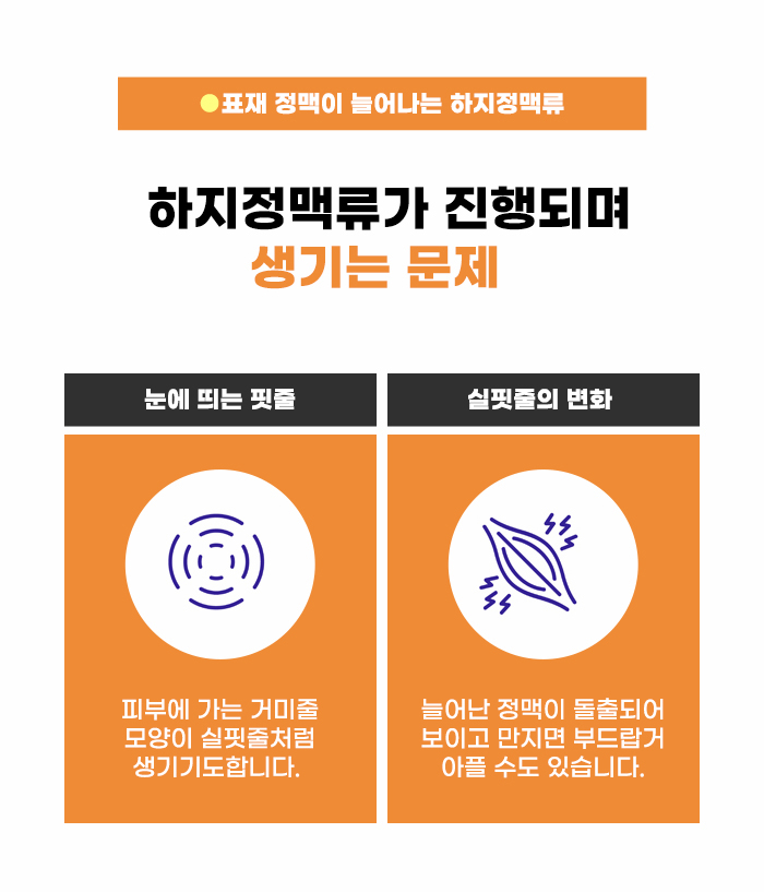 정맥의 판막이 약해지고 손상되면서 생기는 하지정맥류! 하지 정맥 안의 압력이 비정상적으로 높아질 경우 정맥 벽이 점점 약해질 수 있는데요. 이런 이유로 판막이 손상되고 심장으로 향해야 하는 혈액이 역류할 수 있습니다. 이런 과정을 통해 피부에 두드러지는 혈관 변화가 생길 수도 있다고 합니다.