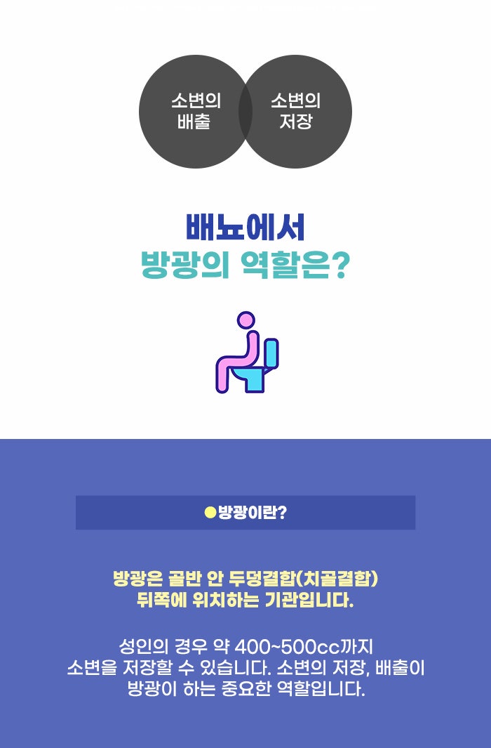 사람의 방광은 신장을 거쳐 만들어진 소변이 모이는 부분입니다. 속이 거의 비어 있는 경우 주름이 많은 납작한 구형 모양이 되며, 소변이 차면서 점막이 늘어나며 매끈한 계란형 모양이 된다고 합니다. 방광은 소변이 모이고 저장되는 곳이며, 이곳에서 소변이 몸 밖으로 배출되는데요. 그렇기에 방광은 소변의 저장, 배출과 관련된 기관이라고 할 수 있습니다.