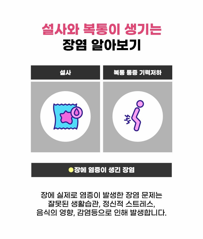 장에 염증이 생긴 장염이 아니라 만성 배변장애가 생기는 과민성대장증후군 문제일 가능성도 있다고 합니다. 과민성대장증후군은 현재의 검사로 원인을 명확하게 알기 어려운 것이라고 하는데요, 하지만 만성 배변장애가 나타나고 설사, 변비, 더부룩함, 복부 팽만, 잦은방귀 등의 증상으로 일상생활에 어려움을 겪을 수 있는 문제라고 합니다.