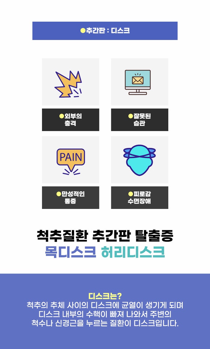 이런 문제가 생긴 것을 두고 추간판 탈출증이라고 하는데요. 추간판의 영어 이름을 디스크라고 합니다. 그렇다 보니 발생 부위에 따라서 목 디스크, 허리 디스크로 추간판 탈출증을 간단히 부르는 경우가 많습니다. 노화가 진행되면서 함께 진행되는 퇴행성 변화, 평소의 잘못된 자세 거북목, 잘못된 평상시 활동 등에 의해서도 디스크 문제가 생기지만, 교통사고로 인해서도 파주교통사고후유증 고민되는 디스크 문제가 생길 수도 있다고 합니다.