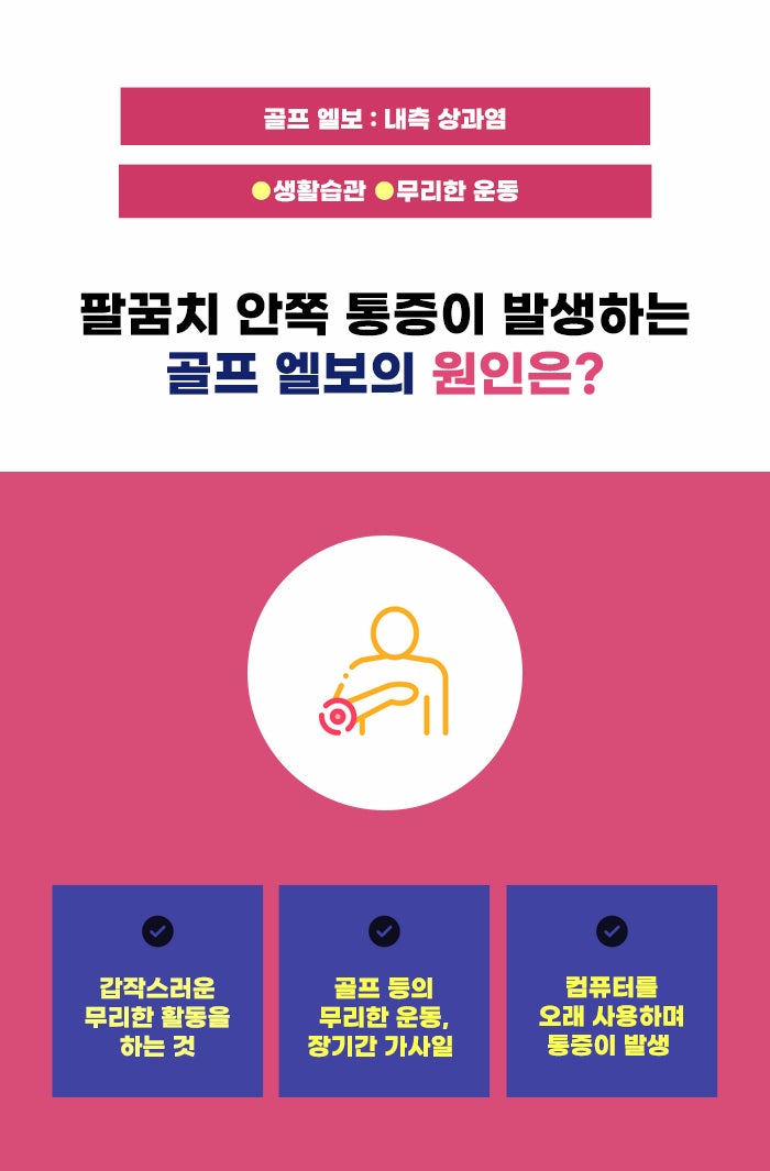 바로 골프 엘보인데요. 테니스 엘보와 다르게 팔꿈치 안쪽에 통증이 주로 생기는 게 특징입니다. 테니스를 자주 치는 분들보다는 주로 골프를 많이 치는 분에게 생기다 보니 골프 엘보라는 별명이 붙게 되었다고 합니다. 팔꿈치 안쪽 부분에 흔히 생기는 염증성 질환 중 하나라고도 알려져 있다고 합니다.