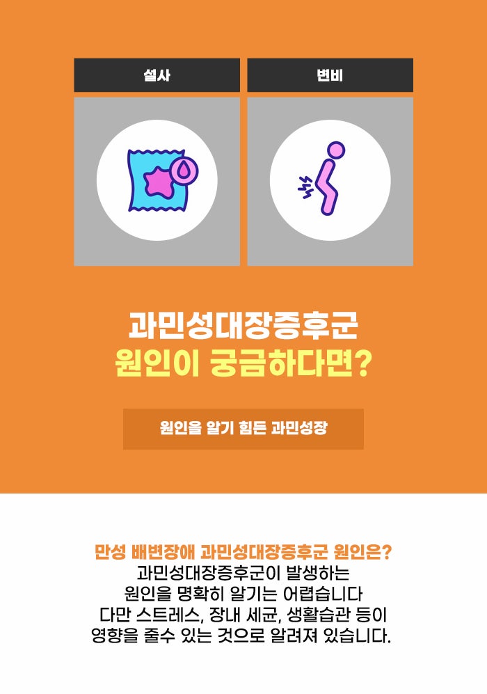 장염의 경우 장의 염증 등 장 관련 이상 증상이 생기는 원인이 뚜렷한데요. 하지만 과민성장증후군의 경우 염증, 혹은 구조적 문제 등 왜 증상이 생기는지 원인을 파악하기 어렵습니다. 하지만 배변 장애를 오래 겪으면서 실제 생활에서 많은 어려움을 겪을 수 있습니다. 사실 변비나 설사 증상, 방귀가 자주 나오는 증상이나 배에서 꼬르륵 소리가 크게 나는 증상 등은 누구나 쉽게 겪는 증상입니다.