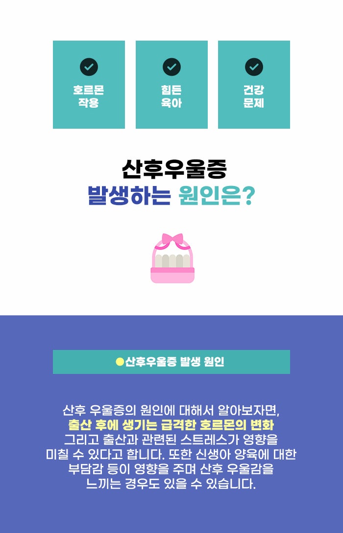 출산 후에 신체적 어려움을 겪는 것만이 아니라, 심리적 어려움을 겪는 분도 있습니다. 특히 요즘은 육아의 부담이 아이를 낳은 부부에게 더욱 클 수 있는데요. 과거에는 아이 양육을 함께할 수 있는 가족구성원이 많았지만, 현재는 그렇지 않다 보니 아이 양육에 대한 부담이 더욱 커지고 있는 것 같습니다. 이런 육아에 대한 부담과 신생아에 대한 책임감, 그리고 호르몬 변화 등의 작용으로 생기는 출산 후 우울감이 있습니다.