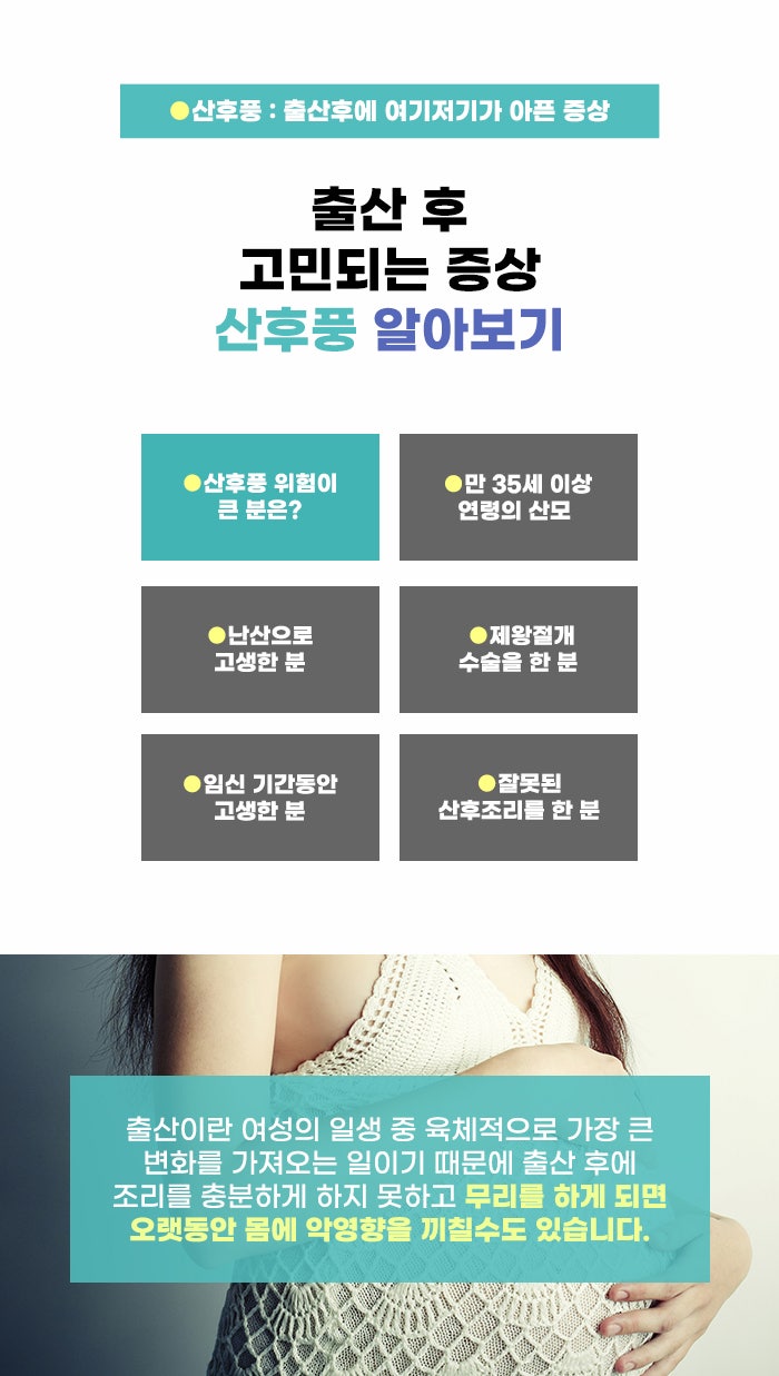 출산 후에 생기는 여러 신체적 증상, 통증 등을 두고 산후풍이라고 합니다. 몸에 바람이 든 듯이 차고 시린 증상, 관절이 아픈 증상이 특징이다 보니 산후풍이라고 불리고 있다고 하는데요. 출산 후 몸조리를 잘못한 분의 경우 출산 이후 세월이 십여년, 수십 년이 흘렀지만 출산 후 관절이 아픈 경우, 손목이나 발목, 허리 등이 아프다고 하는 경우도 있다고 합니다.