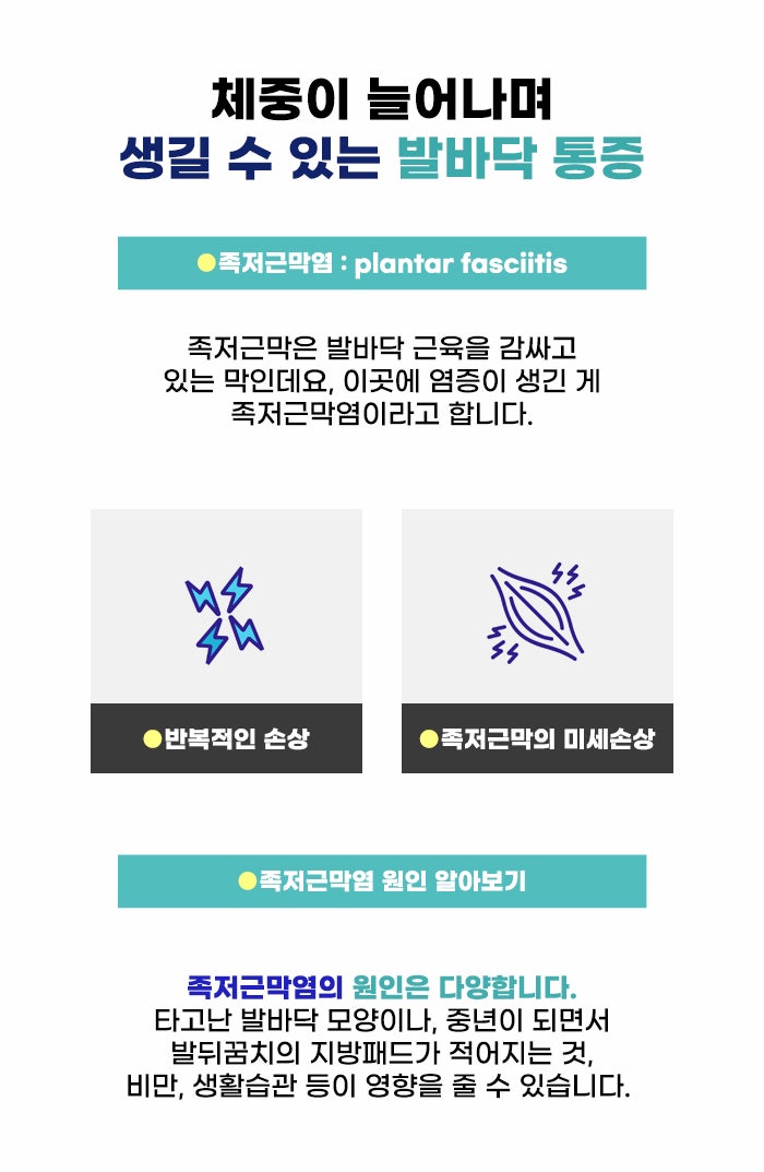 그리고 현재 체중이 늘어나면서 생길 수 있는 통증 문제에 시달리는 분도 있을 수 있는데요. 발바닥이 아픈 족저근막염은 특히 무리한 운동을 한 분, 과체중이나 비만이라서 발바닥에 부담이 더 큰 분에게 발생하기 쉬운 질환이라고 합니다. 이런 통증은 다이어트와 운동을 더 힘들게 할 수 있으며, 시간이 지나며 더욱 악화될 수도 있기에 꼼꼼히 살펴보며 올바른 대응을 할 수 있었으면 합니다.