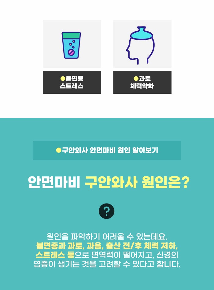 그리고 운정구안와사 발생 원인이 명확하게 밝혀지지는 않았지만 불면증, 과로, 피로, 스트레스, 출산 전/후 체력 저하 등의 다양한 문제가 영향을 미치는 것으로 알려져 있다고 하는데요. 그렇기에 이런 문제를 겪고 있는 중이라면 되도록 빠르게 건강한 생활 방식을 되찾기 위해서 노력하셨으면 좋겠습니다.