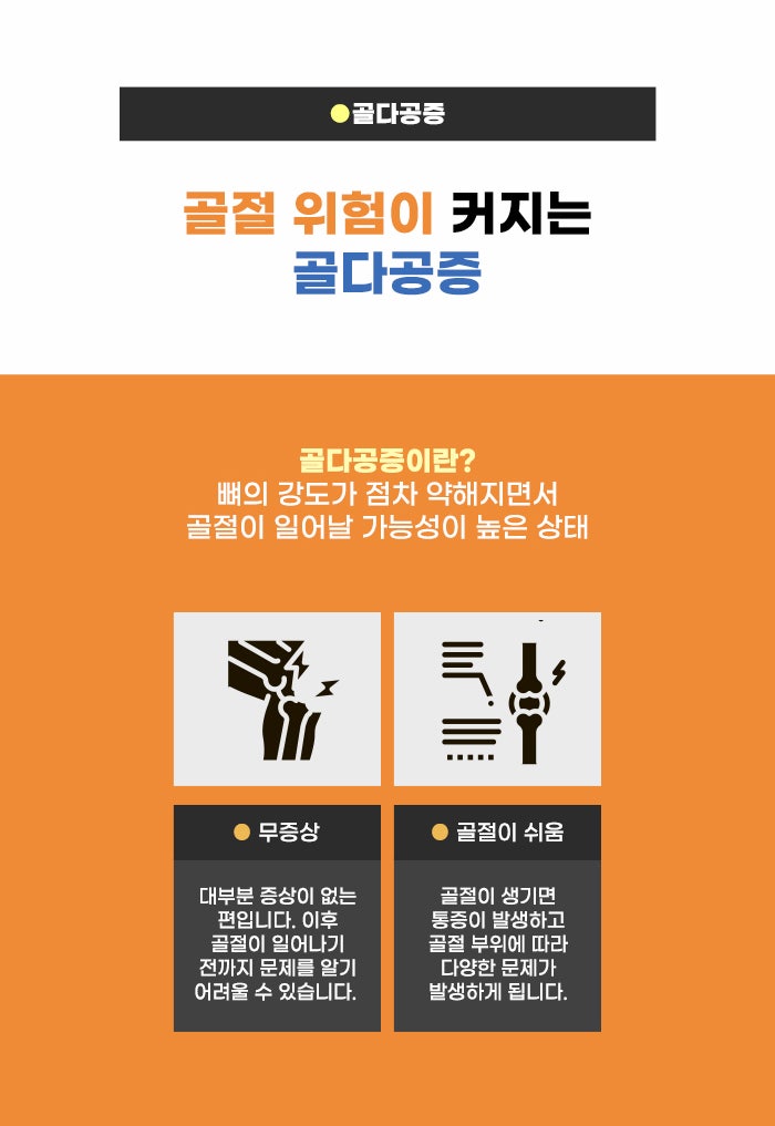 골다공증은 뼈의 질이 낮아지면서 작은 충격을 받았을 때도 골절이 쉽게 생기는 상태가 되는 것이라고 합니다. 노년층에게 많지만 특히 여성에게 더욱 흔한 문제라고 하는데요, 키가 젊은 시절보다 줄어드는 것 등의 변화가 생기기도 하지만 골다공증은 뚜렷한 증상이 없다 보니 잘 모를 수 있습니다. 그렇기에 중년 이상의 연령인 분이라면 골다공증과 뼈 건강에 관심을 갖고 예방을 위해 힘쓰셨으면 합니다.