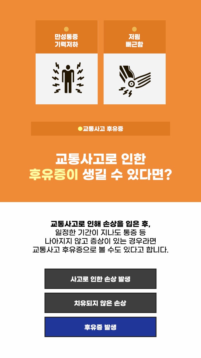 또한 같은 자동차를 타고 같은 사고를 겪었다고 하더라도 모든 분이 같은 정도의 손상이 생기는 것은 아닙니다. 같은 차를 여러 명이 타고 이동하다 사고가 났는데, 다른 사람은 문제가 없더라도 나까지 무조건 문제가 없진 않을 수도 있습니다. 사고 당시 앉은 위치, 사고 당시 상황, 개인의 건강 상태, 연령 등이 많은 영향을 미칠 수도 있다고 합니다.