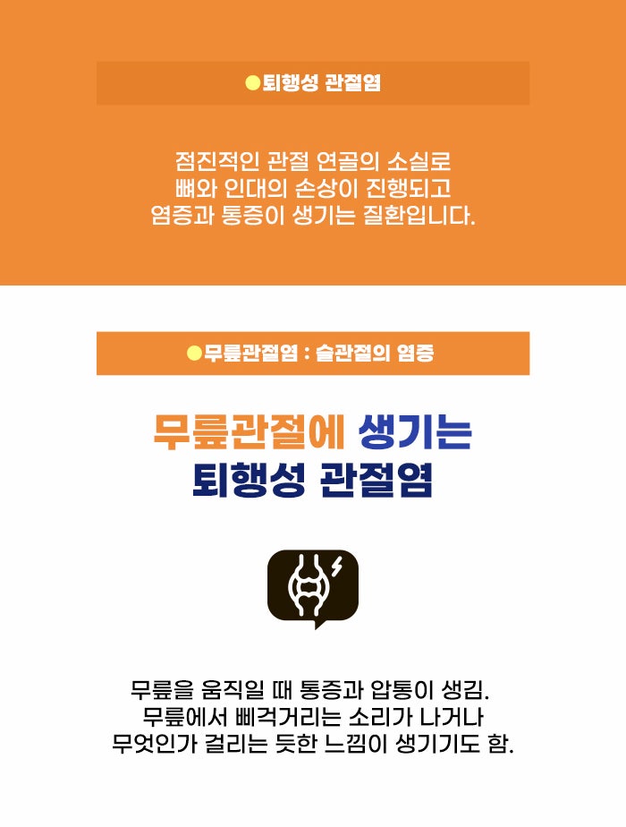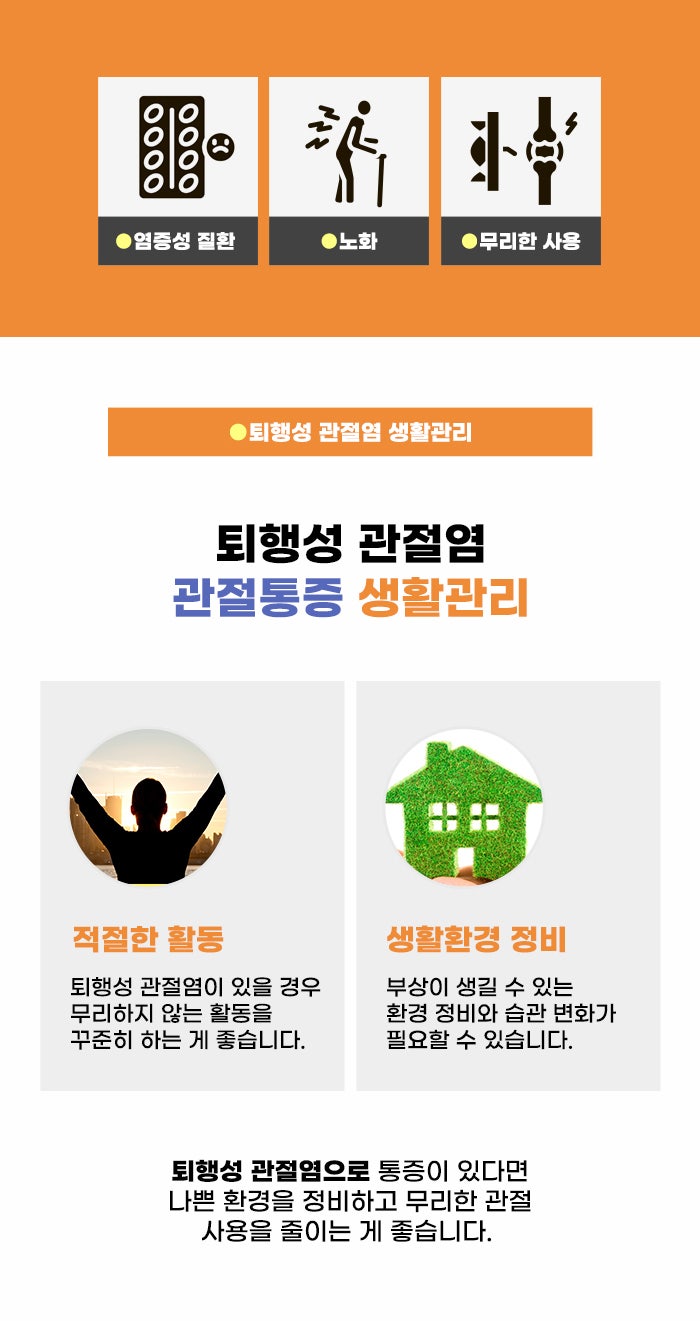 퇴행성 관절염은 대표적으로 잘 알려지고 가장 흔한 편에 속하는 관절 질환이기도 합니다. 특히 노화, 오랜 시간 관절을 무리해서 사용한 것 등으로 심해질 수 있다 보니 고령층에게 이 질환을 가진 분이 많은데요, 특히 집안일을 하며 무릎 관절에 부담을 많이 준 주부에게 무릎 관절염이 흔한 편이라고 합니다. 시간이 지나면서 악화될 수 있기에 걱정되는 통증이 있다면 관절 건강에도 관심을 가졌으면 합니다.