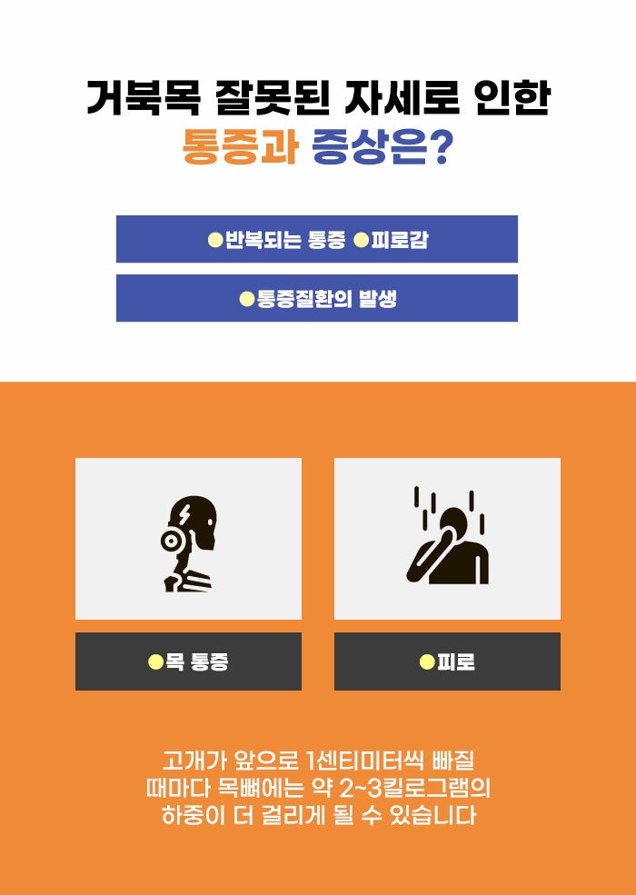 고개가 앞으로 1센티미터 정도 더 앞으로 빠지고 잘못된 자세를 할 때마다 경추에 더해지는 하중은 약 2~3킬로그램씩 더 늘어나기도 하는데요. 심한 거북목인 분의 경우 약 15킬로그램까지도 더 하중이 더해질 수 있습니다. 목의 하중이 더해짐에 따라서 디스크의 부담도 커지고 주변 근육이 긴장하거나 신경이 눌리기도 합니다.