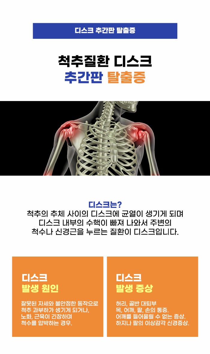 경추에 있는 디스크에 과도한 부담이 더해질 경우, 디스크가 찢어질 수 있습니다. 그리고 내부에 있는 수핵이 돌출되면서 신경근에 자극을 가하기도 하고, 여러 신경 증상이 나타날 가능성도 있는데요. 이를 두고 간단히 디스크라고 부르며, 원래 이름은 추간판 탈출증이라고 합니다. 디스크 문제 부위에 따라서 두통, 어깨 통증, 팔과 손의 통증, 저림 등이 나타날 수도 있다고 합니다.
