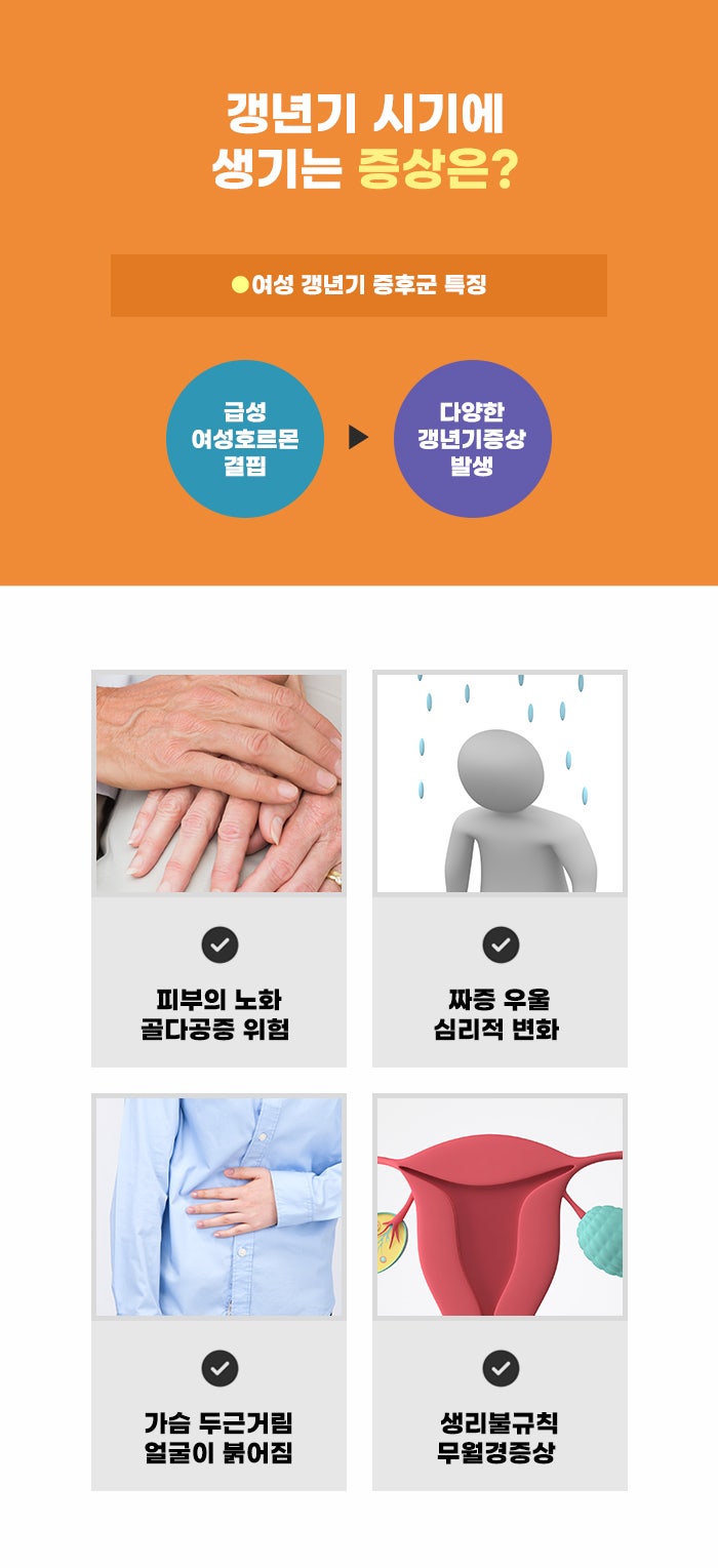 또한 여성호르몬은 월경을 하도록 하는 역할만이 아니라 피부와 혈관을 튼튼하게 하는 역할을 하고 우리 몸에서 많은 일을 합니다. 그렇다 보니 갱년기 시기가 되면서 피부 노화, 골다공증 등을 겪고 고민할 수도 있다고 합니다. 갑자기 나이가 들어 보이기도 하고, 고지혈증과 비만 등의 위험도 커질 수 있다고 하는데요, 특히 골다공증의 위험도 커질 수 있으며 증상이 없는 골다공증을 잘 모르고 있다가 이후 골절이나 몸의 문제가 생기고 나서야 골다공증이라는 것을 알게 될 수도 있습니다.