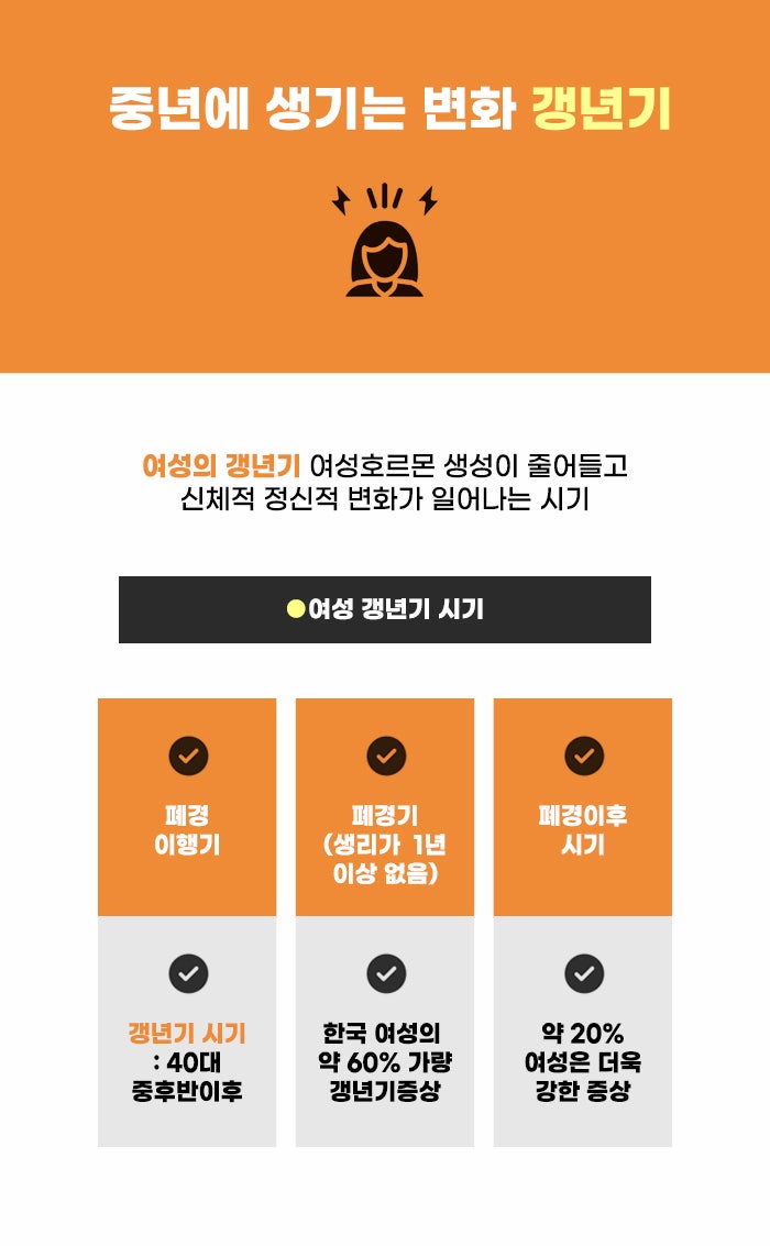 갱년기 시기에는 여성 호르몬 분비가 줄어들게 되는데요, 거의 평생 여성호르몬의 강한 영향을 받던 신체는 이런 여성 호르몬 분비 부족으로 인해 여러 문제를 겪게 될 수 있습니다. 현재는 우리나라 여성의 건강과 영양 상태 변화로 인해 갱년기 시기 연령도 늦춰지고 있다는 말도 있는데요, 평균적으로 봤을 때는 40대 중후반 이후에 갱년기 시기를 겪는다고 합니다.