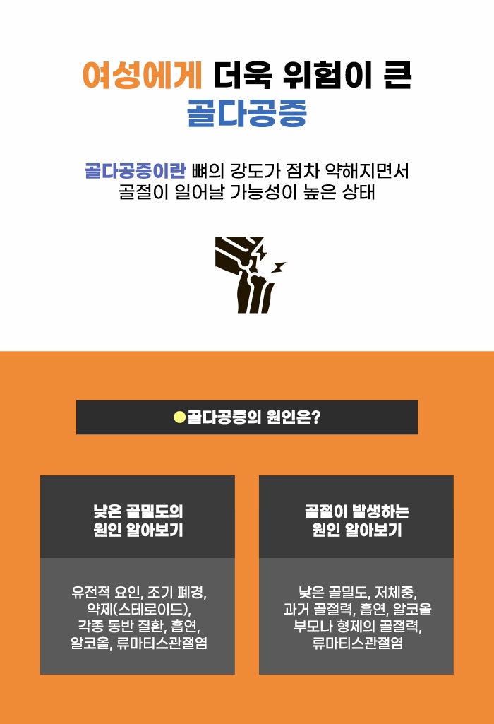 골다공증은 뼈의 밀도가 줄어들고, 뼈의 질이 낮아지는 것인데요. 이런 이유로 골절이 쉬워진다고 합니다. 가벼운 충격에도 골절이 생기고, 심지어 기침이나 재채기를 하다 골절이 생기는 경우도 있습니다. 골절이 생길 경우 우선 골절 자체로 인해 통증과 불편을 겪는데요. 부상 부위에 따라서 회복이 어렵고 후유증이 남기도 합니다.